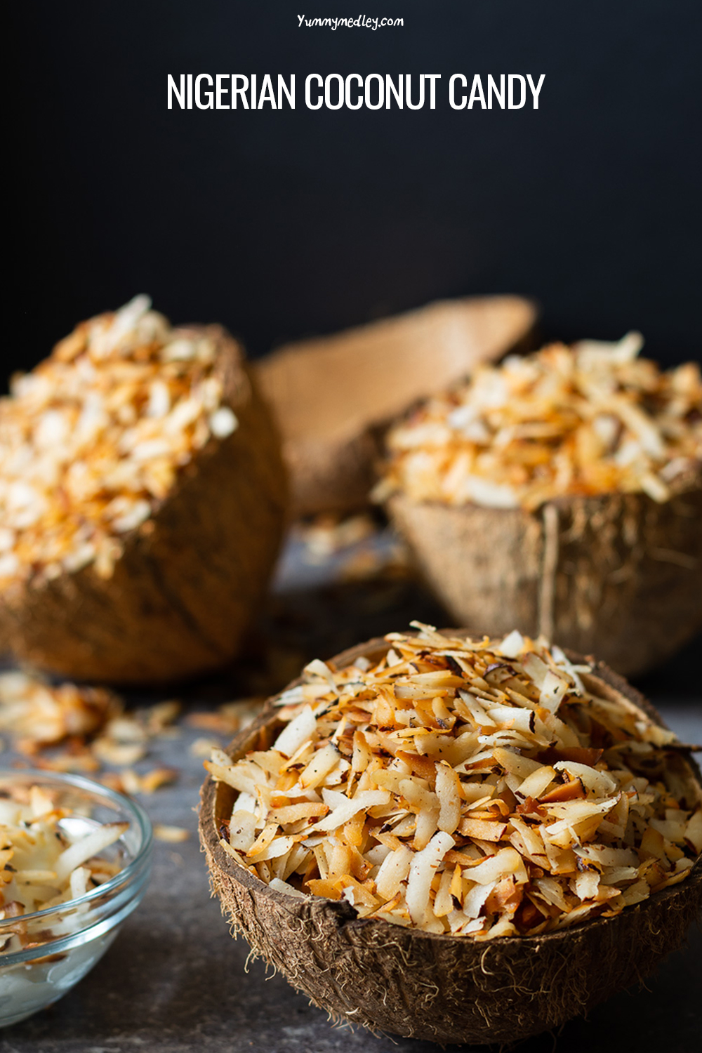 This Nigerian coconut candy is a popular street snack enjoyed by Nigerians and is eaten by itself, or can be served as a topping for ice-cream, yogurt, and even with garri.